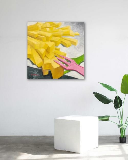 Clin d’œil à la culture populaire – on entend presque résonner le fameux « des frites, des frites, des frites ! » – ses toiles explosent de couleur et de gourmandise visuelle.