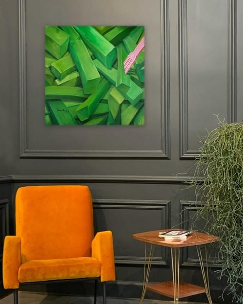 Clin d’œil à la culture populaire – on entend presque résonner le fameux « des frites, des frites, des frites ! » – ses toiles explosent de couleur et de gourmandise visuelle.